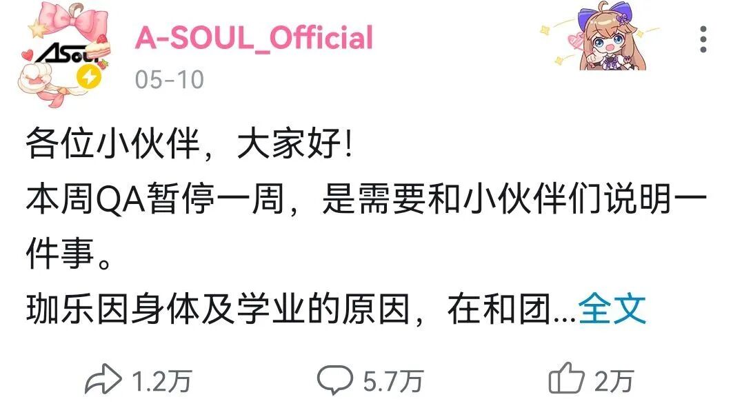 但最近发生的一系列风波,却让原本发展势头良好的A-SOUL企划在一夜之间濒临崩溃,所有之前累积的矛盾,都在5月10日(本周二)下午四点半,官方发布的珈乐终止活动公告的那一刻瞬间爆发。
