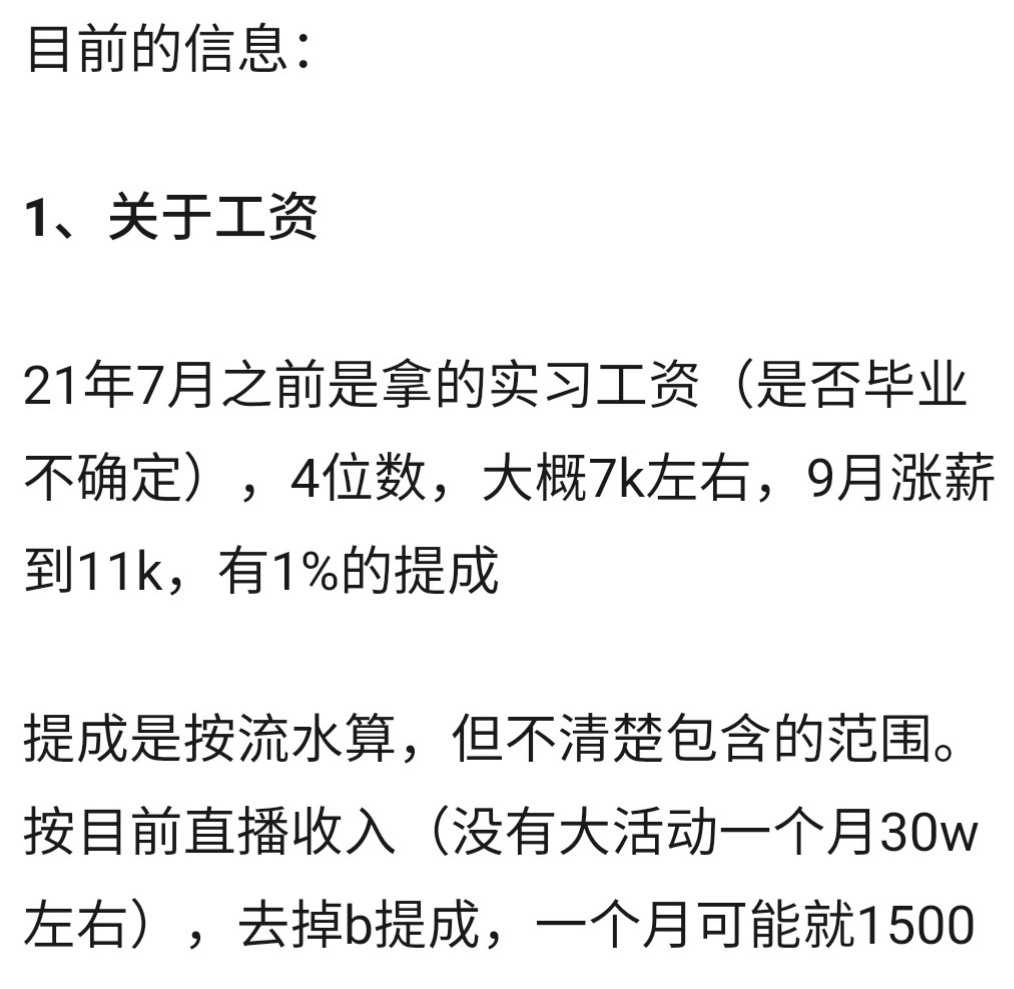 与此同时,更多或来自内部的爆料开始被火速传播,有多方的消息源表示,五个姑娘的收入状况相当不理想,在几乎做到了行业头部的情况下,她们的薪资水平仅仅只达到了杭州的中等水平,续约前拿的是实习工资,续约后仅仅只加了1%的分成。也就是说,一份138元的直播舰长,在去掉平台分成后,到她们手里的就剩6毛钱。