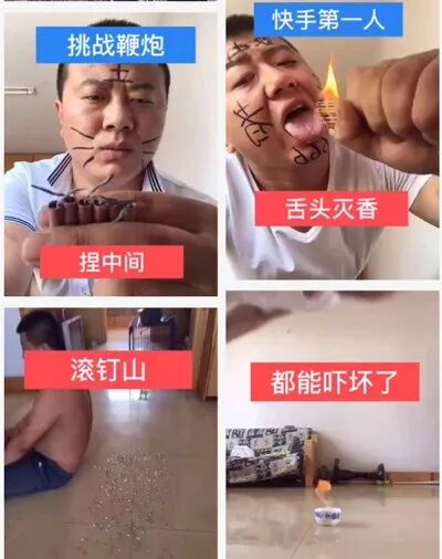 人们愿意用“百花齐放”来形容那个时代,可能是因为这些建立在身体伤害、甚至危及生命边缘的刺激行为,实在考验了普通人的想象力,比如冬天跳冰窟窿,头开西瓜,嘴叼28大杠,鼻子抽烟,鞭炮炸牛......