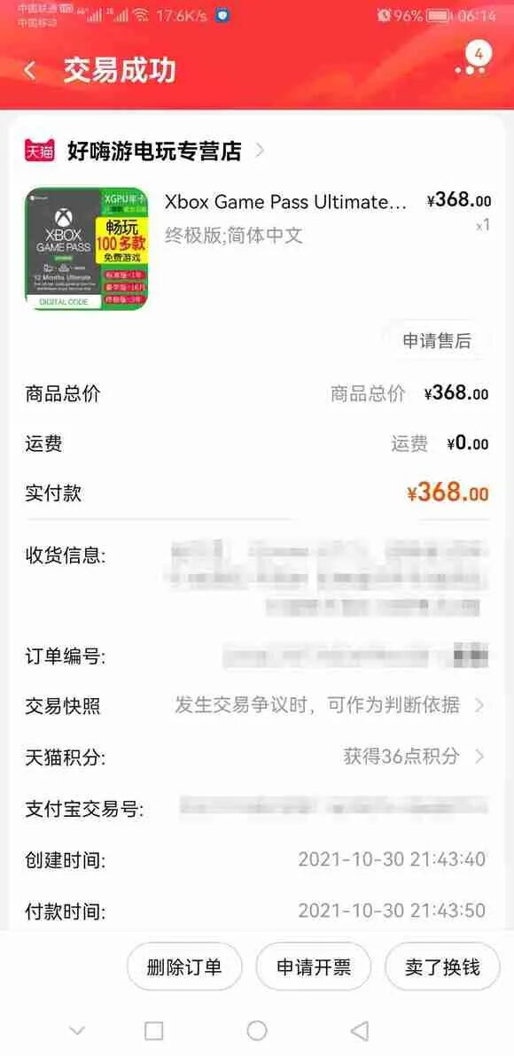 至于已经翻车的朋友,请注意保留好微软提供的邮件作为证据,因为微软已经将款项退到了卖家的卡上,玩家可以从退款邮件中知道,当初卖家到底花了多少钱给你开的3年XGPU,联系卖家要求退款,或者举报卖家,申请某宝介入,目前已经有玩家通过淘宝介入获得了全额退款。