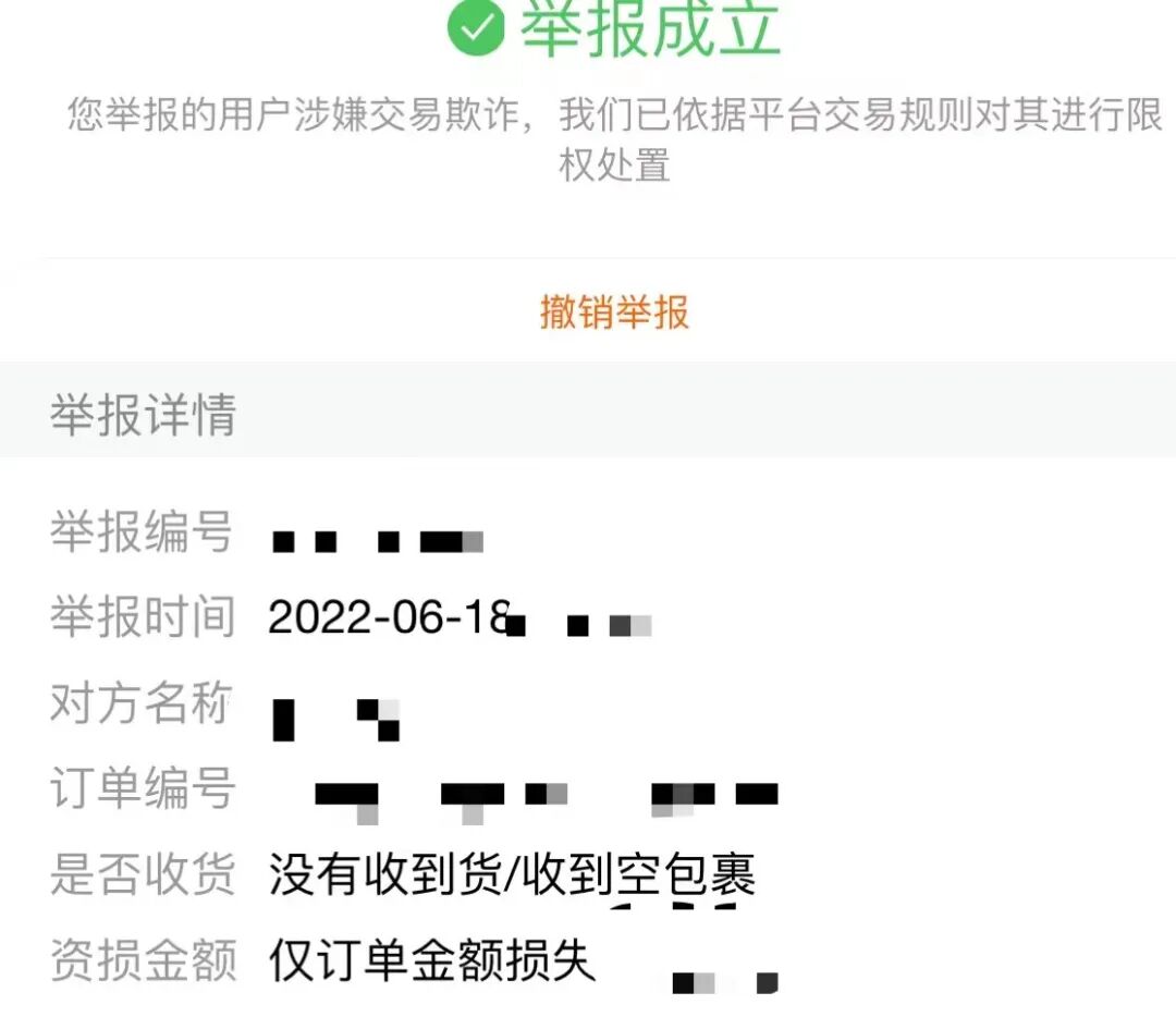 提交申请后,因为恰逢周末,其实我对12315处理投诉的响应速度并不抱多少期望,所以又用相同的理由在某宝的订单页面提交了举报商品的工单。