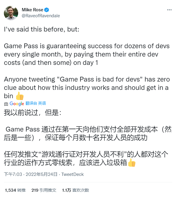 正如《遵命陛下》《流浪先知》等游戏的发行商「No More Robots」负责人Mike Rose所说的一样,微软Game Pass每个月会在游戏发售首日向开发者支付费用,保证他们获得收入,第一天就赚回本钱。