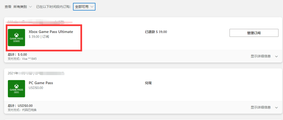 翻阅当时的聊天记录和账单记录,我的账号先是兑换了一年Xbox金会员,然后再兑换了一定时长的XGP,最后升级至一年的XGPU——这也是微软官方认可的薅羊毛方式。