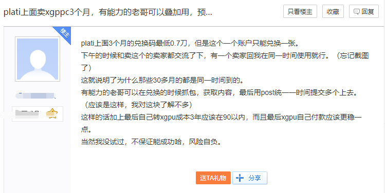 而根据某位卖家发布的自证聊天截图,双方在去年11月中旬通过微信和机翻交流,买方要求购买20000个3个月PGP兑换码,单个价值6.4元。如果这个金额属实,那么三年XGPU的成本大概在80元左右,换句话说,即使玩家花费100元购买三年服务,卖家也能获得占成本25%的利润。