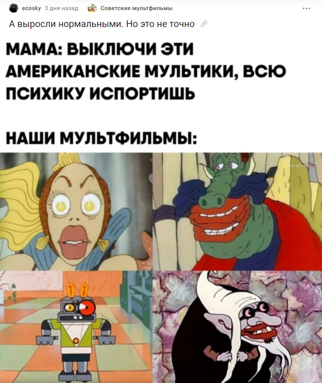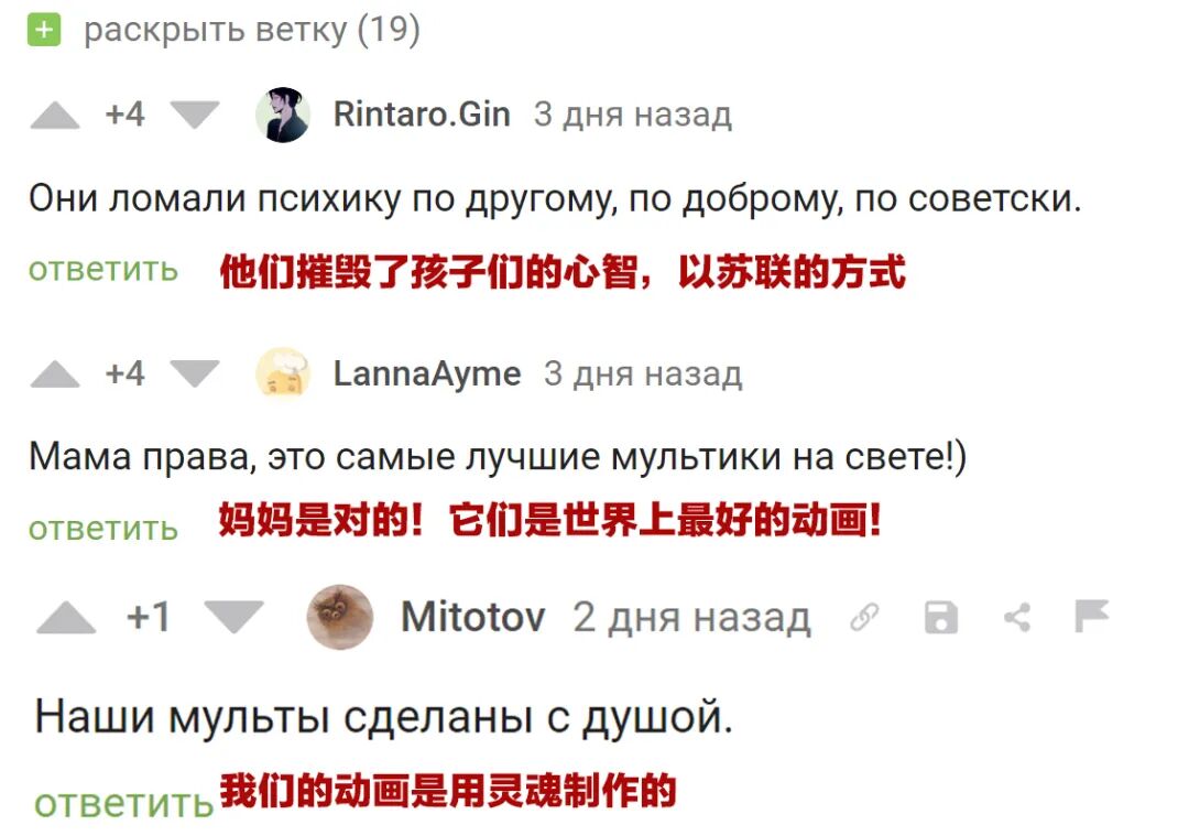 至于毛子们对这些动画是怎么看的,除了被吓到大之外,他们观点针锋相对的分化成了两个阵营,一边认为这东西危害极大,是毒草,是辱俄的“雄狮少年”,另一边却认为相比现在的动画这玩意儿才灵魂神作:
