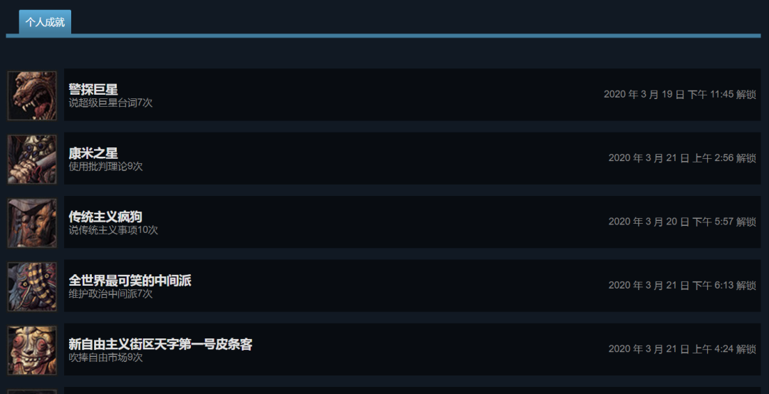 我更喜欢在《极乐迪斯科》里与各个都是哲学家的NPC思辨唠嗑,自我反省,然后Steam跳出成就一会骂我是“新自由主义街区天字一号皮条客”,一会又夸我是“康米之星”。