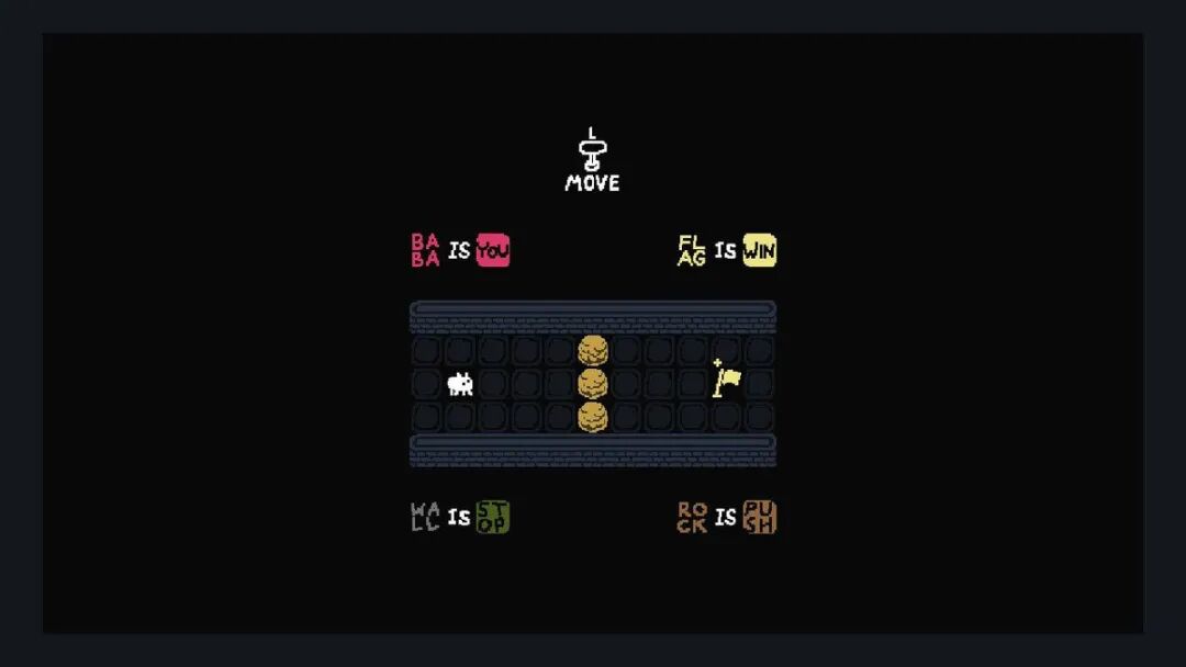 《巴巴是你》是一个可以和规则交互的游戏,比如看起来获胜条件是flag is win,你可以挪动字块来改成rock is win