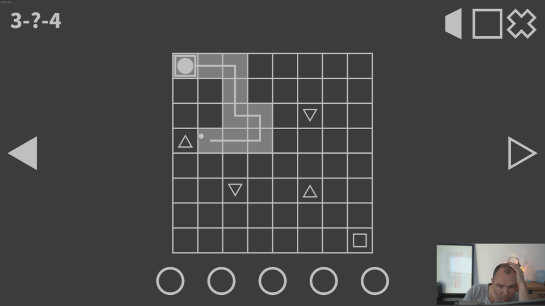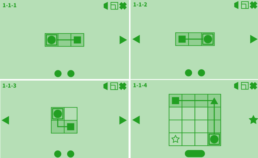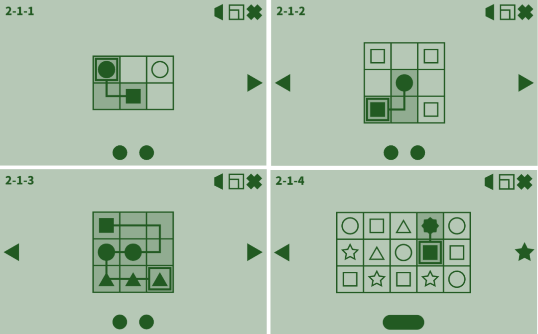 我们再直接跳到2-1,这和第一章有很大差别。第一章10个小关虽然规则各不相同,但存在一个相似之处:起点和终点的形状固定。于是,这就造成了一种思维陷阱,以至于我个人在2-1这一关卡了好一会儿。至于规则到底是什么,我便不再多说了。