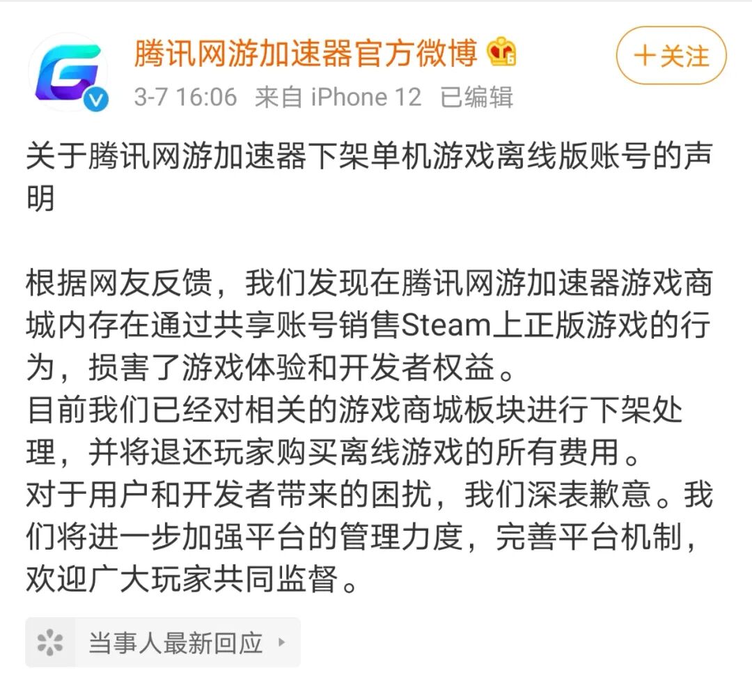 可惜的是,大厂们并不愿对这次事的发生原因做过多解释。腾讯网游加速器官方微博很快发布道歉声明,声称给所有购入盗版的玩家退款,但是对此前经营方式为何欠规范、欠审查只字不提。