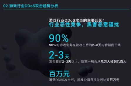 阿里云的报告显示,在中国大陆,有90%的游戏业务在被攻击的2-3天内便会彻底下线