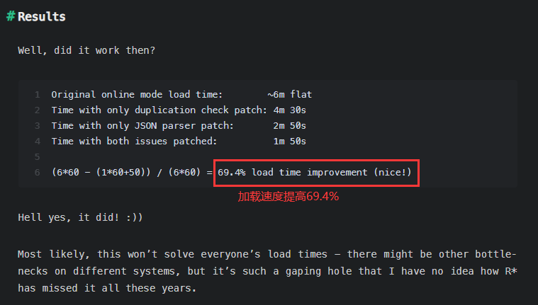 对原本动辄几分钟甚至几十分钟的载入时间而言,这无疑是一个巨大的进步,而这其中需要的工作量——按照t0st本人的说法,应该花费不了一个开发人员超过一天的工时。t0st甚至给R星留下了一些建议,希望这些优化建议有望付诸实施,毕竟,考虑到玩家已经忍受了相当长的一段时间,R星也是时候做点什么了。