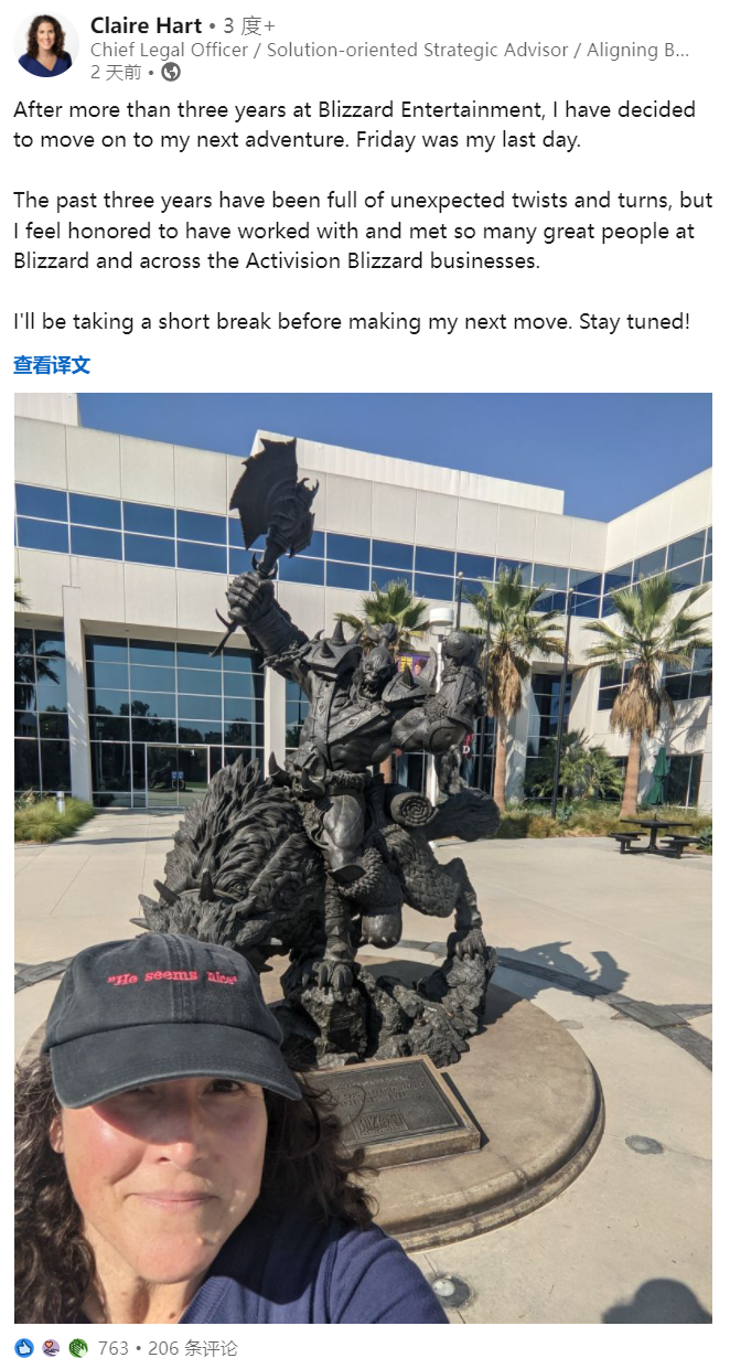 作为首席法务官的 Claire Hart,肯定受到了这几个月来的风波的影响。可想而知,她这两个月来承受了多大的压力,能够在9月17日顺利离开暴雪,从这些烂摊子中抽身,她的心中也一定在窃喜吧。