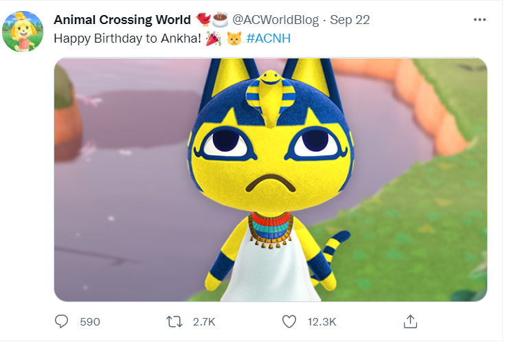 9月22日,是“艳后”的生日。推特上一位著名的动森博主“Animal Crossing World”像对待其他游戏中的小动物一样,发布了一条推特来庆祝“艳后”的生日。