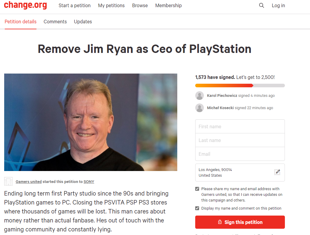 这几天,在请愿网站Change上出现了这样的一份请愿书:游戏玩家们向索尼请愿,解除现任索尼互动娱乐(SIE)总裁吉姆·瑞安(Jim Ryan)的职务。