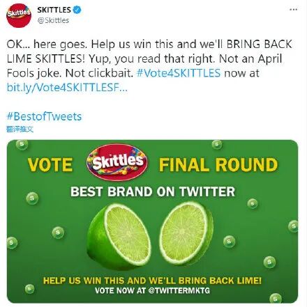 Skittles也不示弱,表示如果他们赢得胜利,青柠口味的彩虹糖便会回归。