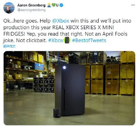 为了拿下比赛,Xbox游戏市场营销部总经理Aaron Greenberg发推表示,如果Xbox赢得此次评选,那么Xbox Series X外形的迷你冰箱就会在今年投入生产。