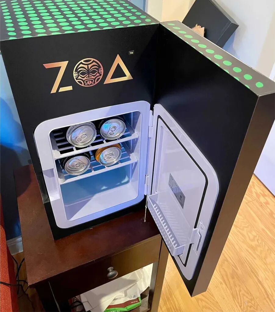 此前微软曾经和能量饮料品牌ZOA合作过一次,生产过ZOA联名的XSX迷你冰箱,我们可以猜测一下量产版的造型,大概长这样: