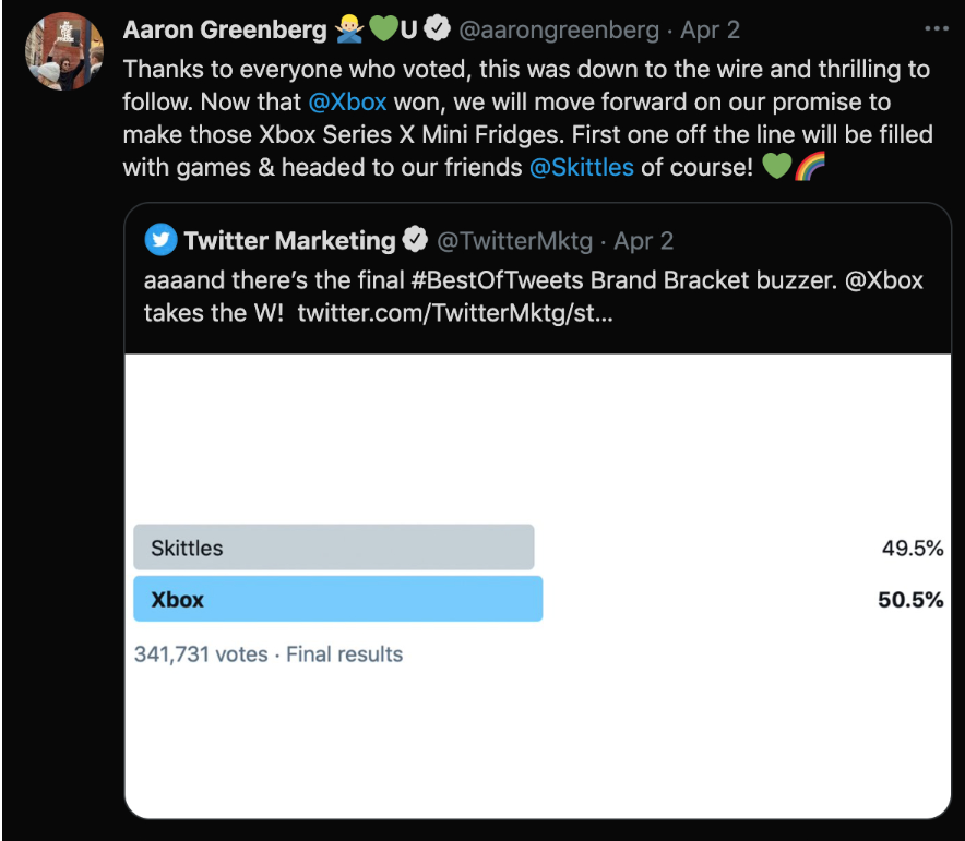 在4月2日的决赛中,Xbox以50.5%的投票率、1%的微弱优势击败彩虹糖Skittles,获得了“推特最佳品牌”称号。