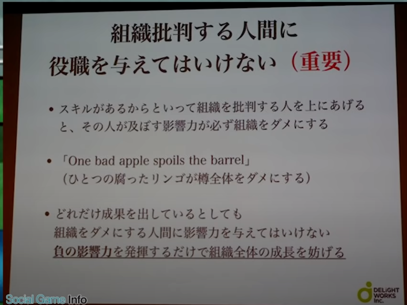 更重要的是,DW内部工作风气不佳,不允许反对意见,在工作PPT中直接表示“不能给批评组织的人职位(重要)”,社内只喜欢歌舞升平即使是《樱花革命》被疯狂炎上的时候,包含马场英雄在内的世嘉和DW的管理层只会交流好消息,员工反应负面消息也只会被无视。