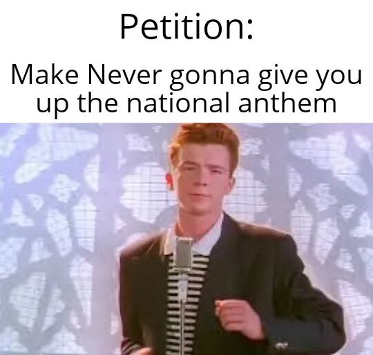 国歌部分则得到了高度的统一,采用名梗Rickroll的万恶之源、Rick Astley演唱的《Never Gonna Give You Up》作为国歌!(如果你想知道这首歌为什么成为欧美地区的名梗,可以参考我们以前的这篇文章:《不要点开这篇文章》)。