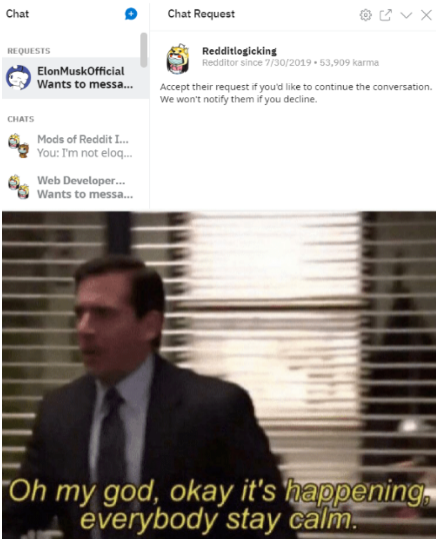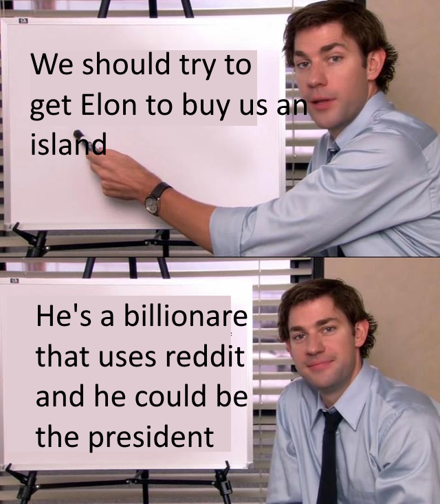 当然也有少部分深谙世事的网友,显然他们懂得社会人的处世之道——让伊隆·马斯克来当领导就好了,首先他是个富翁,可以帮助解决买岛的资金问题;其次他算是个Reddit用户,也是半个自己人,把他找来,皆大欢喜。