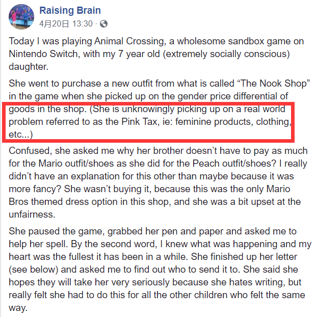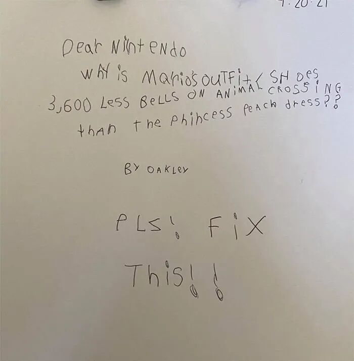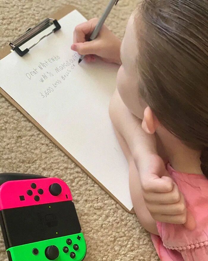 之后这位小女孩停下了手中的游戏,找来了笔和纸,想向任天堂写信以反映服装价格差异的问题。写完之后,她拜托妈妈将信送到任天堂的手中。