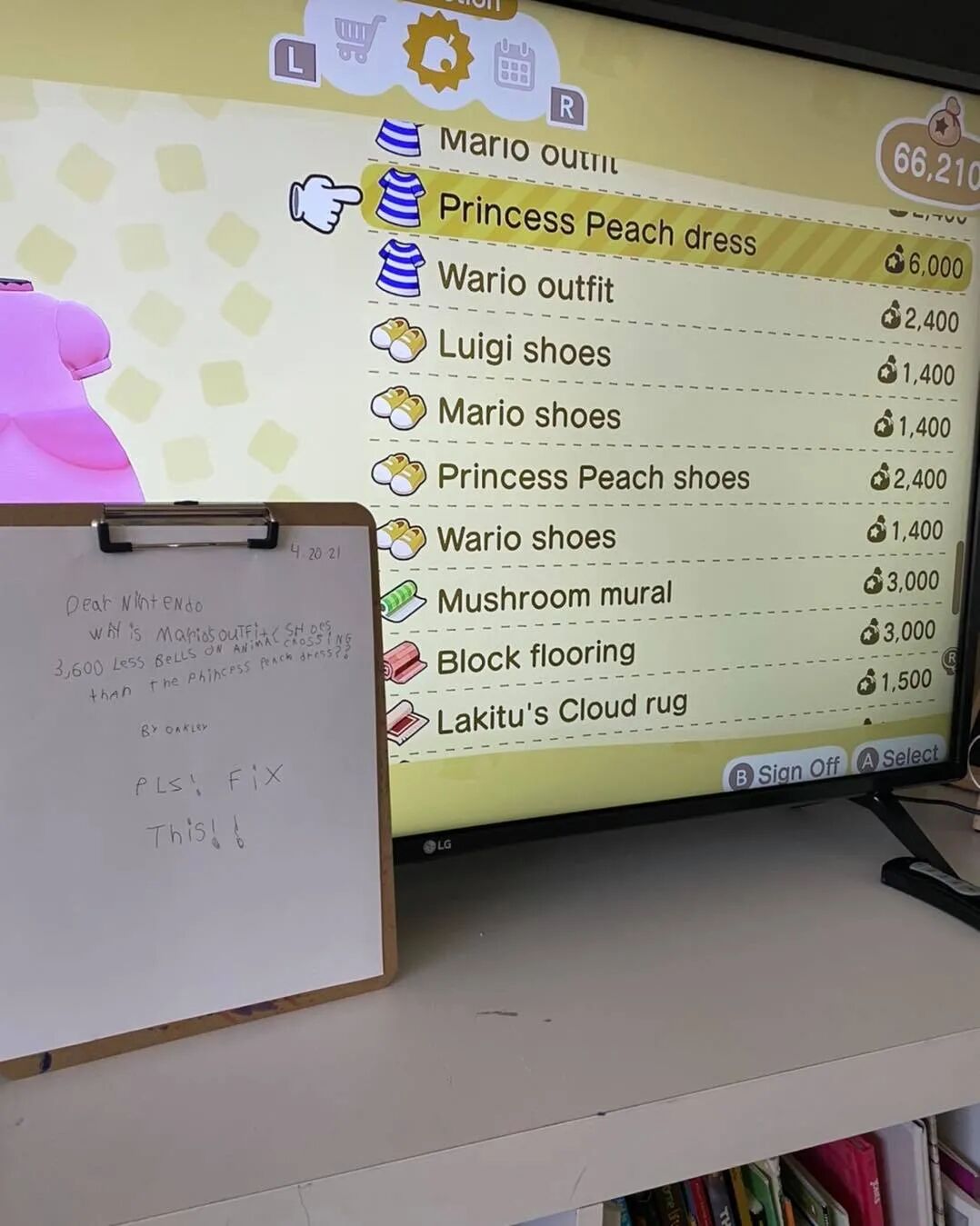 而近日,一位名叫Oakley的七岁小女孩在游玩《集合啦!动物森友会》时,发现了一个问题——在商店中出售的“马力欧”联动服饰,价格并不相同。