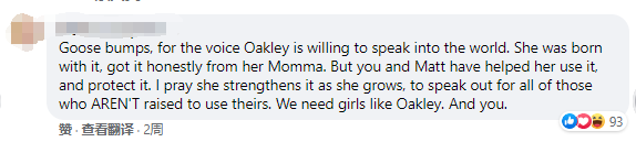 “看得我鸡皮疙瘩都起来了。Oakley愿意向这个世界表达她的声音,这是她从母亲那儿继承的天生的能力。Oakley的父母保护着她,告诉她应该要如何使用这种能力。我祈祷她在成长的过程中能够增强这种能力,为那些没有勇气发声的人发声。我们需要Oakley这样的女孩和你(Oakley的母亲)。”