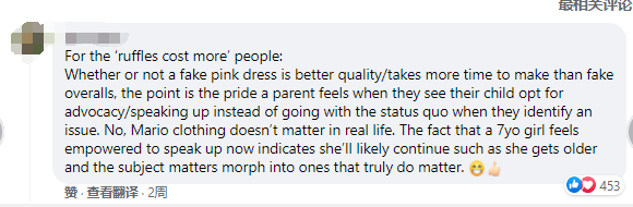 “给那些认为‘礼服褶皱越多所以理应越贵’的人:我们关注的点不应该是一件礼服和一件工作服的价值,而是孩子们在发现问题时不选择顺应现状,选择质疑和改变。马力欧的衣服并不是重点,重点是一个七岁的小女孩能够做出这样的表现,她今后如果继续保持这样的状态,等到她长大了,她就会敢于在更有意义的话题上发声。”