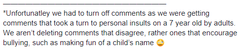 “很不幸,我们不得不关闭评论功能,因为我们发现了好多不友好的评论。我们并不是想要控评,但是侮辱孩子的评论实在是太多了,比如说把她的名字拿来开玩笑。”