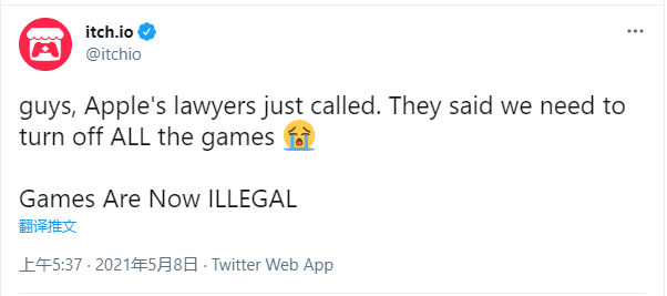 针对苹果代理律师的指控,itch.io发文表示:“朋友们,苹果的律师团队发话了,他们说我们得关闭(平台上)的所有游戏,游戏现在是非法的了。”