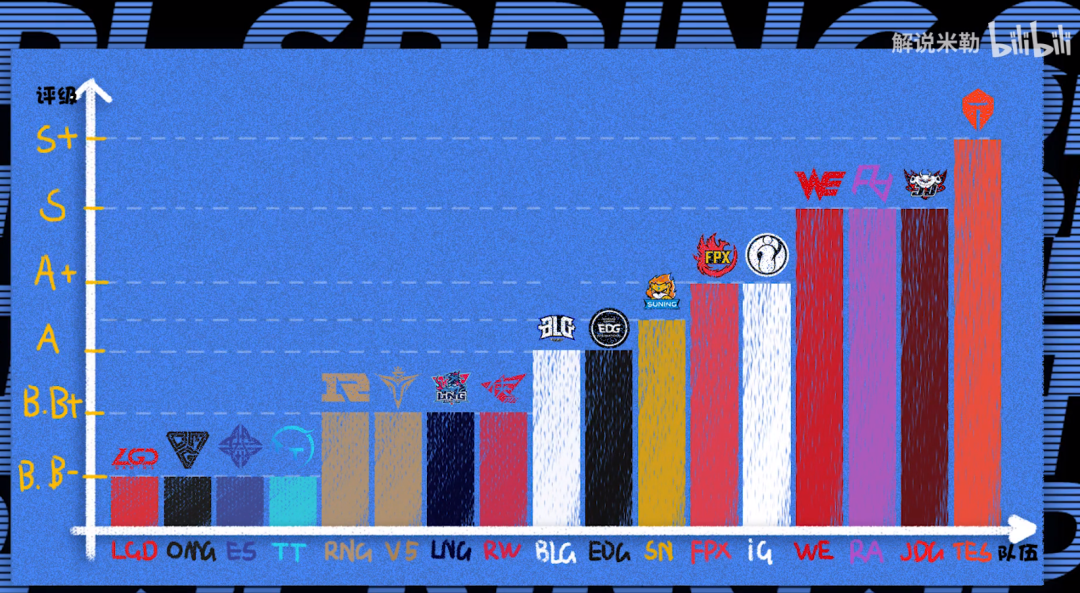 在开赛之前,LPL著名解说米勒做了一个分析战队阵容强度的视频,将RNG排到了B+末尾,位列17支队伍中的第13名。也就是说,在前十名能够进入季后赛的情况下,RNG只能将将摸到季后赛的边缘。