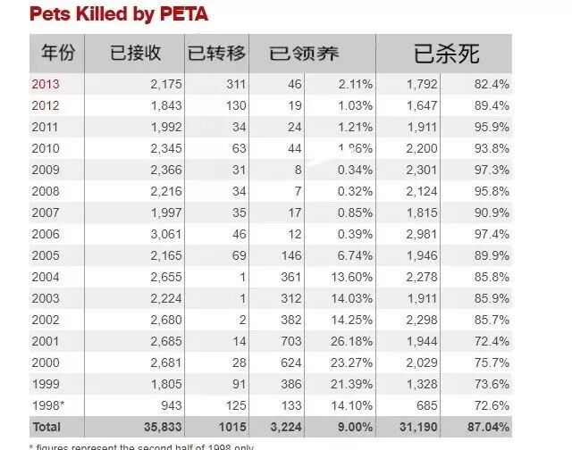 作为一个动物保护组织,收留遗弃宠物是一个很重要的业务,而根据美国弗吉尼亚州政府披露的数据显示,1998至2013年间,PETA共收养了35833只宠物,其中的31190只宠物被实行了安乐死,安乐死率高达87%——要知道,弗吉尼亚州所有动物收容机构对收容动物实施安乐死的平均比例仅为35.7%。
