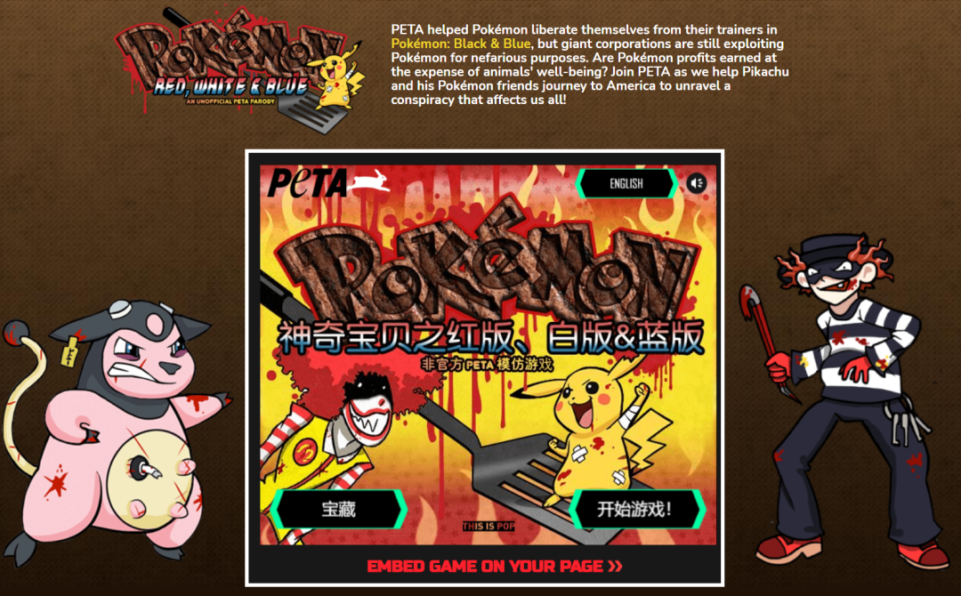 2012年,PETA又先后制作了《宝可梦黑·蓝》和《宝可梦 红·白·蓝》两款游戏,将宝可梦描绘为被人类捕捉和囚禁,并被强迫参与战斗的可怜动物,并将宝可梦训练师们刻画成凶恶残暴,手上沾满宝可梦鲜血的反面角色。有意思的是,《宝可梦红·白·蓝》提供了英文和简体中文两种语言选择,文本质量居然还不错,要知道,当年连任天堂都还没给《宝可梦》系列加入官方中文。