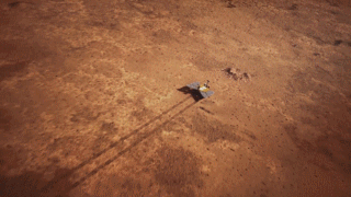 在着陆器距离火星表面仅有100米高时,会进入着陆缓冲阶段。着陆器这时会开始悬停,自主观察火星表面,快速计算出最佳着陆对答案,最终水平移动到该点上方,伸出‘四条腿’,并在稳定着陆后展开舷梯释放火星车。”