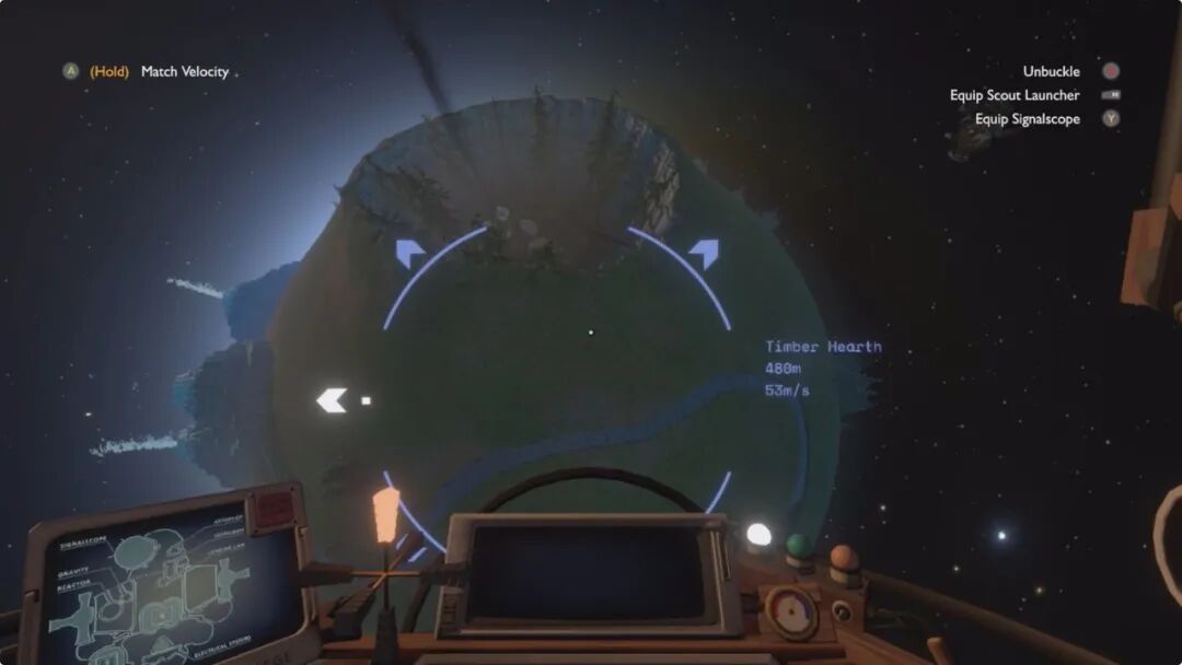 但《星际拓荒》的操作方式却并不友好。游戏中我们旅行的重要方式仍是驾驶飞船,但我们需要考虑的因素相比之前的游戏多得多:飞船不会自动与地面平行,必须随时调整姿态;每个星体都有自转、公转和引力机制,必须注意加减速和轨道变换;降落时最好要切换垂直向下视角,寻找平地缓缓落下,否则飞船极易损坏。