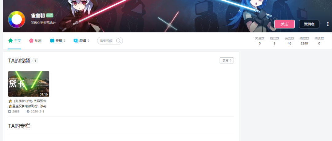 这就是《红楼梦幻战⭐202020》的“官网”,等级2,粉丝3,关注0,整个页面空空如也,只挂着一个孤零零的“先导预告片”。