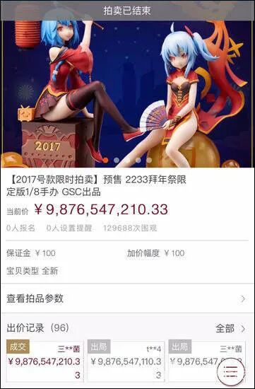2017年,bilibili的2233限定款手办曾在阿里拍卖上拍出过98亿元天价。那是一次典型的拱火不嫌事大的事件,竞拍者视拍卖为儿戏,自以为只是做了个影响不大的恶作剧,但却在事实上极大地破坏了拍卖秩序,浪费了不少社会资源,还害得不少工作人员得为他们擦屁股。