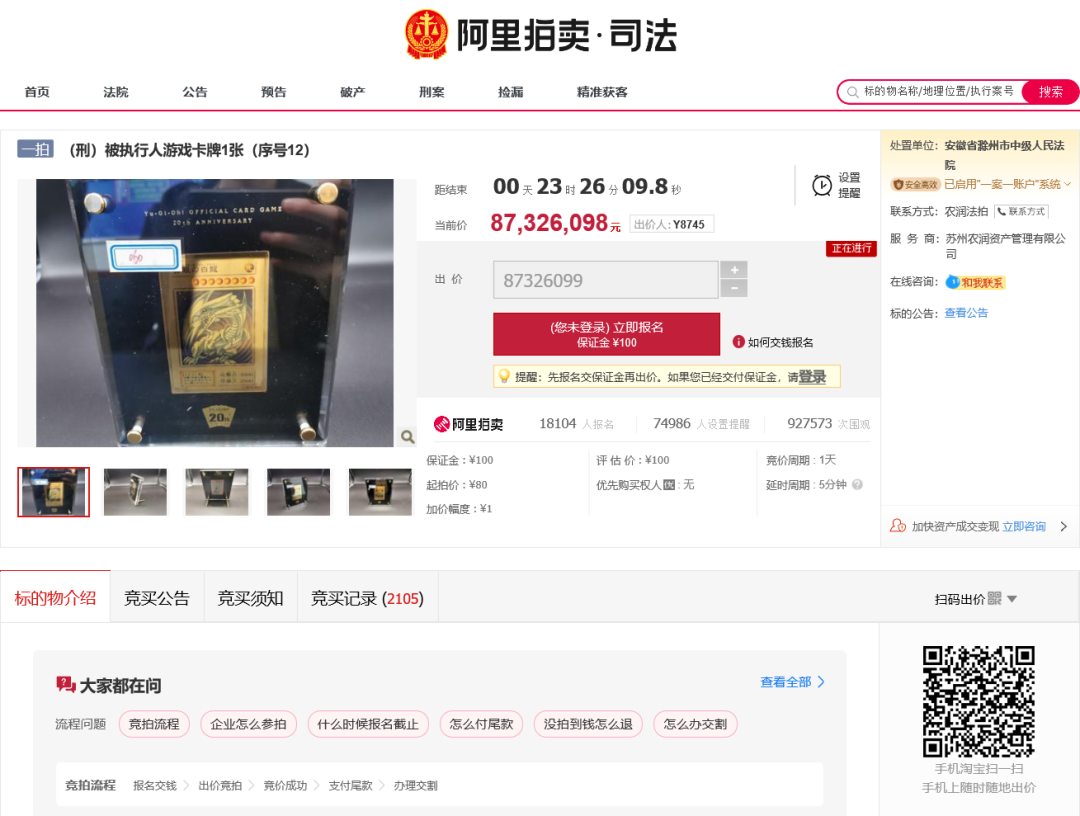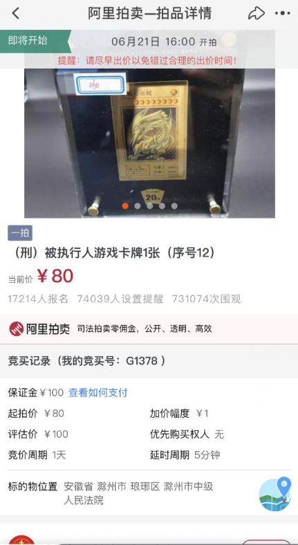 6月21日,也就是今天,一场万众瞩目的司法拍卖开始了。被拍卖的对象,是一张游戏王的“20周年纪念版青眼白龙”金卡。