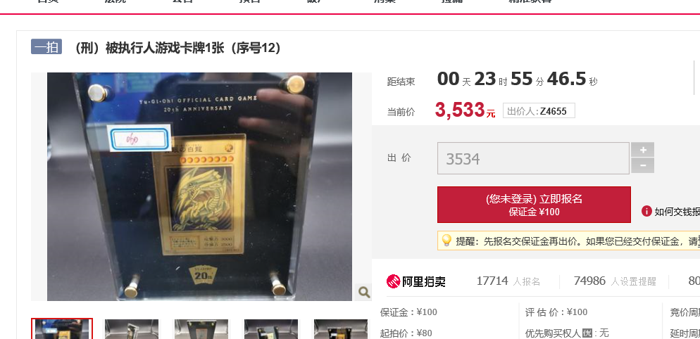 据了解,青眼白龙金卡的市价大概为20万元左右,如果纪念编号不错的话,还能卖出更不错的价钱。因此,报名这次拍卖的人,除了看个热闹的围观群众之外,还有着不少热爱游戏王,梦想着能捡个漏的牌佬——毕竟,起拍价只有80元,要加价到20万元的市价应该没有那么容易。