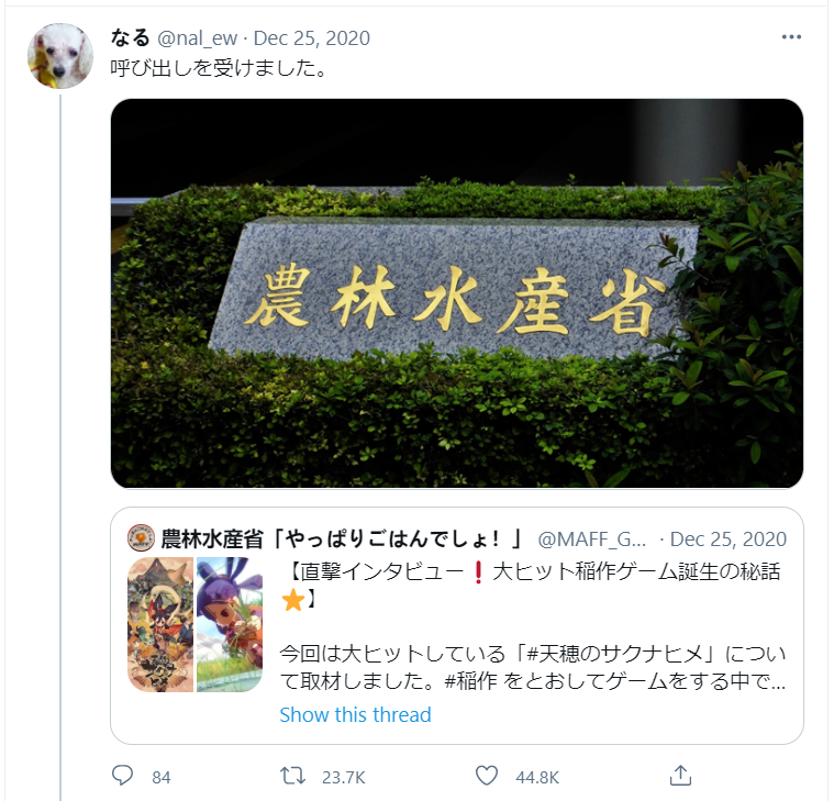 由于游戏种田过程实在过于硬核,也没有详细的内置教程,一度有许多日本玩家前往该政府机关的官网查询“攻略”——也就是那些现实中的水稻种植注意事项,于是制作人なる不久就被农林水产省叫去“喝茶”,事后表示自己还是第一次被政府的人访谈,顺便还夸了夸那里的食堂,说可能是日本政府部门里最好吃的。
