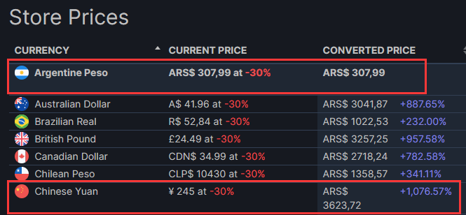 不过,大家也别羡慕真正的阿根廷人。阿根廷区的游戏售价能做到全球最低,一个很重要的原因是其货币贬值速度过快。在全球玩家都觊觎其低价福利时,阿根廷人却天天为过高的游戏售价叫苦连天。