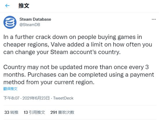 不过,他们这次使用的手段,还是比以前人性化了不少——至少是遣返,而不是封杀。6月23日,SteamDB官推发布信息称,Steam账户切换区域的频率将拉长到3个月1次。在这条推特里,他们表示:Steam做出此举,应该是为了防止玩家利用低价区来购买游戏。