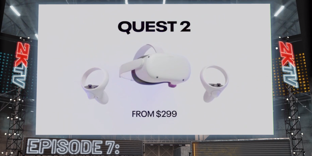 无独有偶,在2K发行的《NBA 2K21》中,也曾在过场动画里加入了不可跳过的大屏Oculus Quest2VR套件广告: