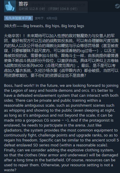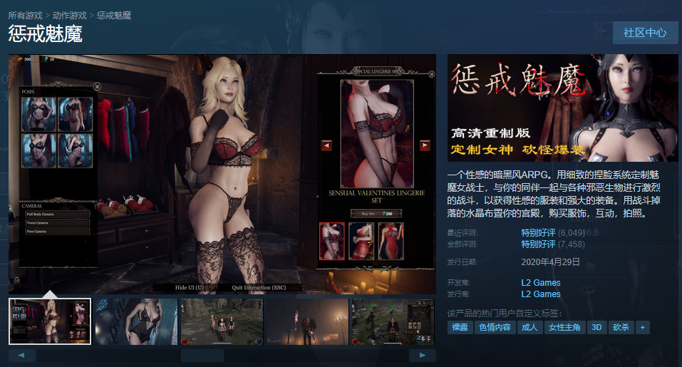 而制作组L2 Games的态度也相当诚恳,不仅在Steam社区内积极回复玩家的意见,对游戏的更新也非常频繁,像是一些玩家吐槽游戏的捏人选项风格过于欧美,不久后游戏就更新了亚洲风格的捏脸数据,看得出来他们想把游戏做好,这也是为什么不少玩家认为《惩戒魅魔》未来可期。(当然也可能是出于对MOD的期待吧。)