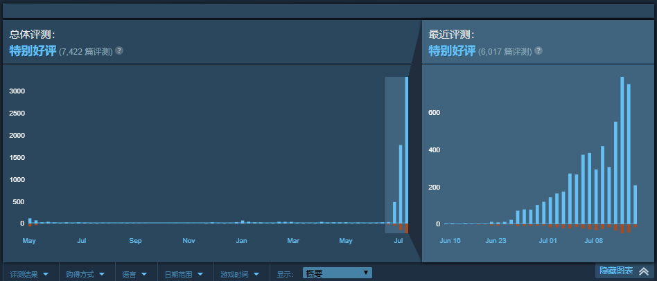 通过评论趋势图可以看出,在2020年4月30日发售抢先体验版本后的很长一段时间里,这款游戏都处在几乎无人问津的状态,和大部分小型工作室开发的作品一样,被淹没在Steam的汪洋大海之中。