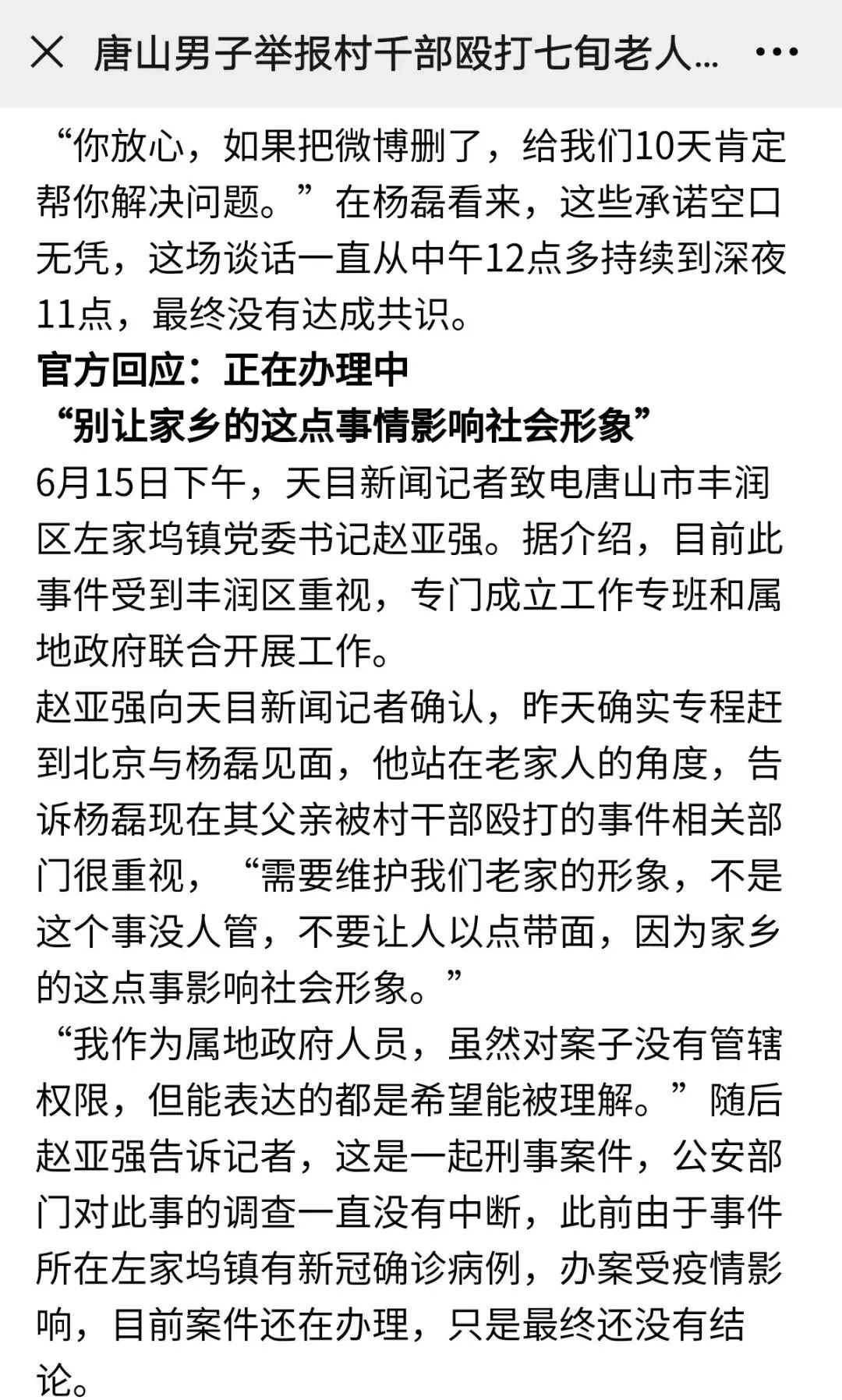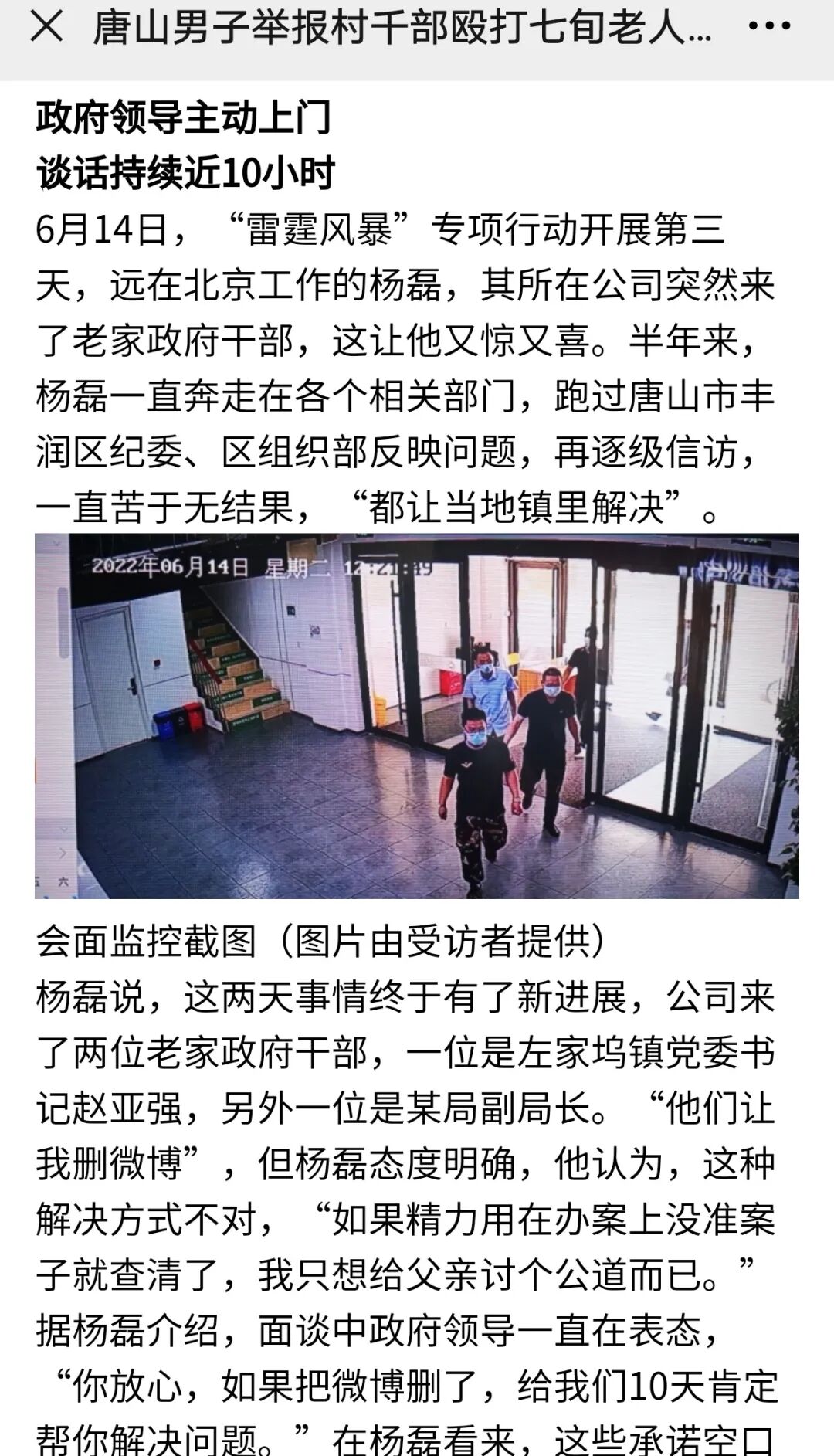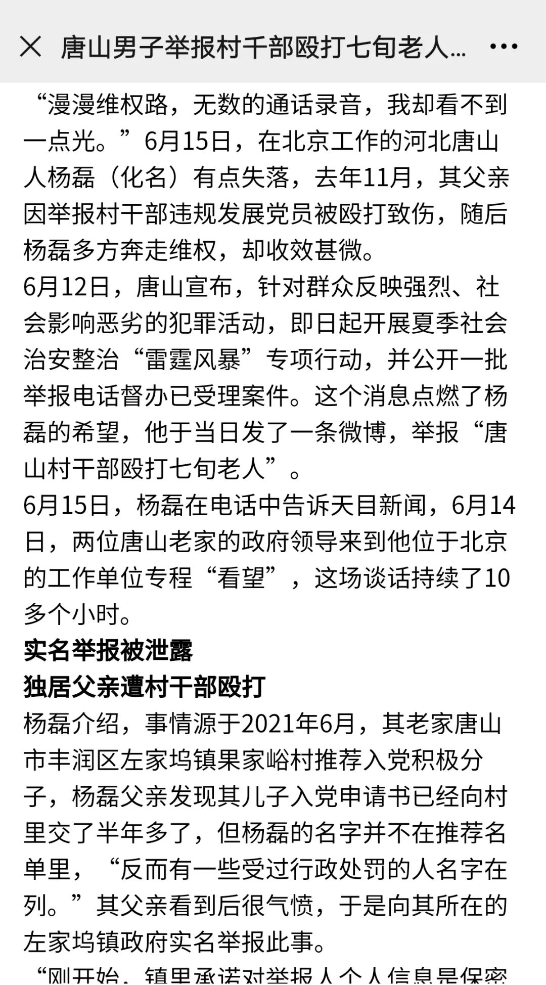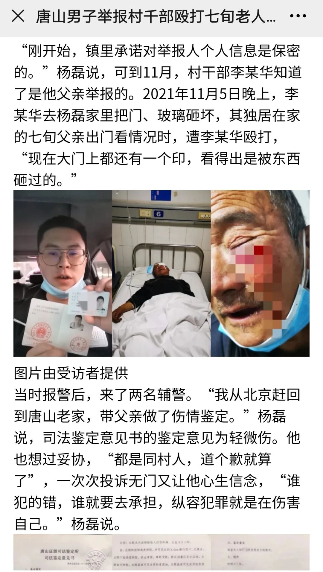 2、担心父母的冲动。唐山“雷霆风暴”行动公布举报方式后,网上实名举报“井喷式”爆发,现地公安局门口人满为患,有网友爆料已累计上百条线索。和年迈的父母通话得知,作为村里有威望的老党员,不少村民主动找上门来,请求他们出面主持公道,借机举报村支书变卖集体土地,私吞公家财产。其实,此事已反映多次,次次无功而返。我只能以保重身体要紧为理由,极力安抚二老情绪,生怕他们遭遇不测。就像这位老者举报被报复,儿子此次在北京发微博再举报,结果第二天当地领导赶赴北京处理。(见下图)其实,“雷霆风暴”行动后,我曾拨打当地公布的5个举报电话,除4个无权限外,1部手机“正在通话中”,最终我也没有等来系统反馈的“将以短信形式通知您”。