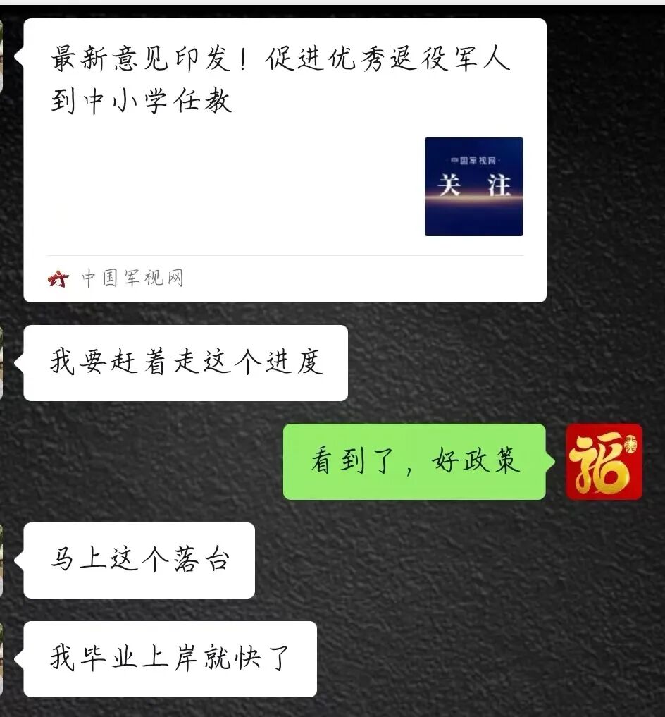 看到《促进优秀退役军人到中小学任教》意见印发,不禁感慨国家下的力度真大,出台政策的速度真快,从正面进攻彻查“毒教材”的幕后黑手,把这些学阀文奸彻底揪出来钉在中华民族的耻辱柱上;从侧面迂回包抄,清除“毒教材”所造成的危害,在退役军人中挑选优秀人才充实中小学教队伍 ,这是个普大喜奔、利国利民的大好消息。