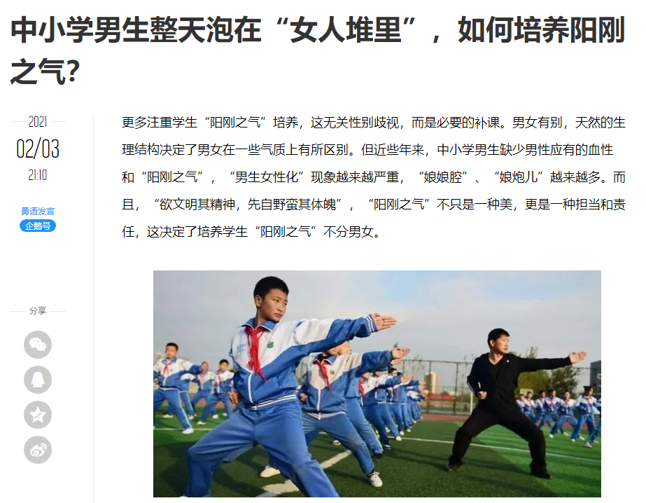 培养学生的“阳刚之气”,不仅是多开设一些体育课程那么简单,关键还是对症下药,让男教师充实到教师队伍中去,特别是阳刚气十足的退役军人, 在耳濡目染中帮助孩子跳出“女人堆”的成长环境。