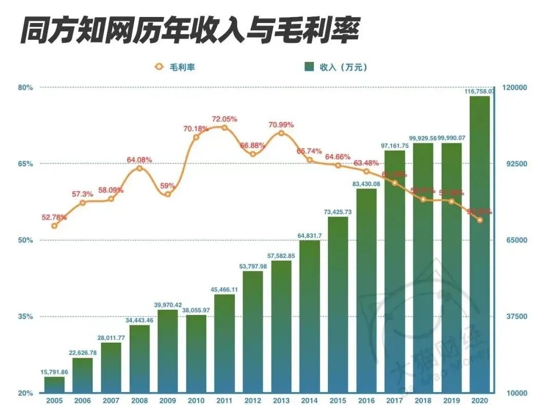 知网从2004年上线,2005年狂撸1.58亿,往后十几年的毛利率一直没有低于50%。2021年,知网收入将近13亿,毛利率达53.35%。